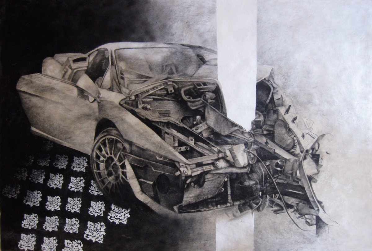 The narrative between the murals ends at the third mural of the clashed car in black and white. The car is hit on a solid column that may imply contingency or human-spirit, which is absolute and infinite. It signifies how fragile and weak the man-made technologies and commodities are, in other words, human-desires. The studio used as an installation space implies a structured frame of ‘society’, in which human psych prevails.