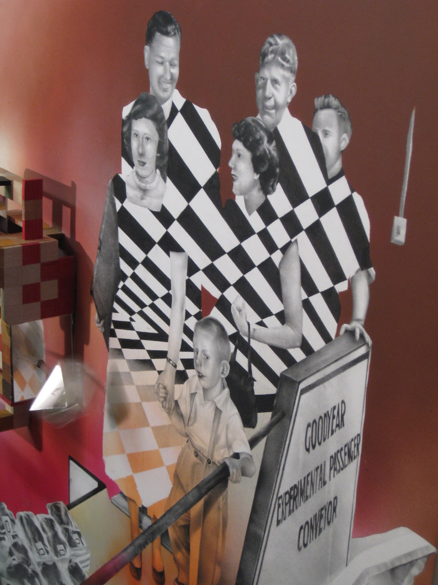 With the technology developments and economy advancement, our quality of life has been improved. However, on the other side of the developments in materiality, whether human-spirit has also been improved is in doubt. In this work, the family is depicted as a metaphor of a certain group of people or country, whom steps on a conveyer where a mountain of packed meats with zero labels wait. The family except a small boy in an optical effect/illusion suggests group-ness or same-minded-ness , in other words, people with the same thoughts and who share the same information, taste of commodity. A small child suggests an unbiased and authentic state. The packed meats represent human-desire and wealth with mass-production, which are cheap and available to everyone with shallowness. The mirrored spinning drill extended from the mosaic mechanic box next to the family symbolizes systematic order and aggression; when the drill spins, the conveyer turns on and everything starts to move forward for good or worse. This work suggests the uncertainty and depression of the technology combined world where things are easily consumed and disposed.