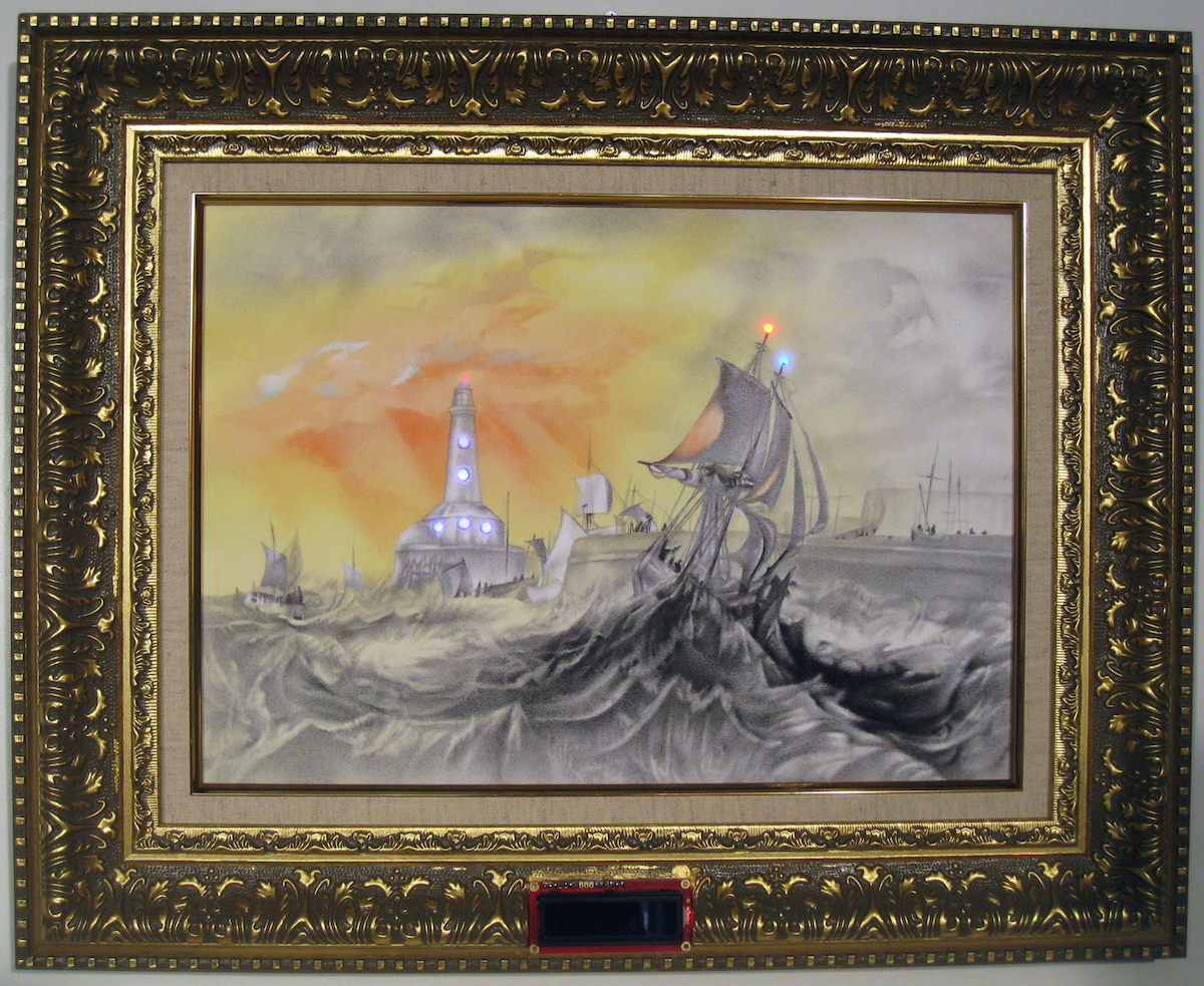 In this modern society, everything that has been considered as bourgeois is commodity in daily life. The role of painter as a magician of pigment to create an illusional space and another world on the 2D canvas received respects from people. However, now those roles are replaced by photography, moving-image and technology, and dispersed the mysterious existence of art and artists. Not everyone is interested in museum to appreciate arts, instead, they watch TV or comic books. If the master painter of J.M. W. Turner exists today while tring to have viewers interests? And where it will be? This is an ironical piece using Turner’s painting the Ports of England (1826-1828) into a drawing with digital melody, texts on LCD screen and LED. The kitschy toy-like work suggests modern consumerism hang at home rather in museum space.