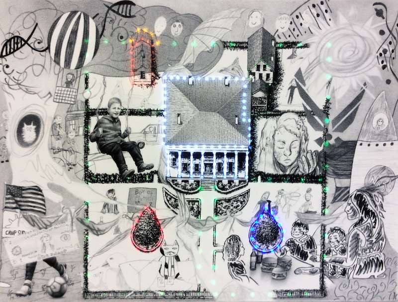 2018, graphite on paper, LEDs, Microcontroller, participants’ drawings, H: 23 x 18”/H: 58 x W: 46cm (central piece on the wall); H: 8 x 11” / H: 20 x W: 28cm and letter size (participants’ drawings)