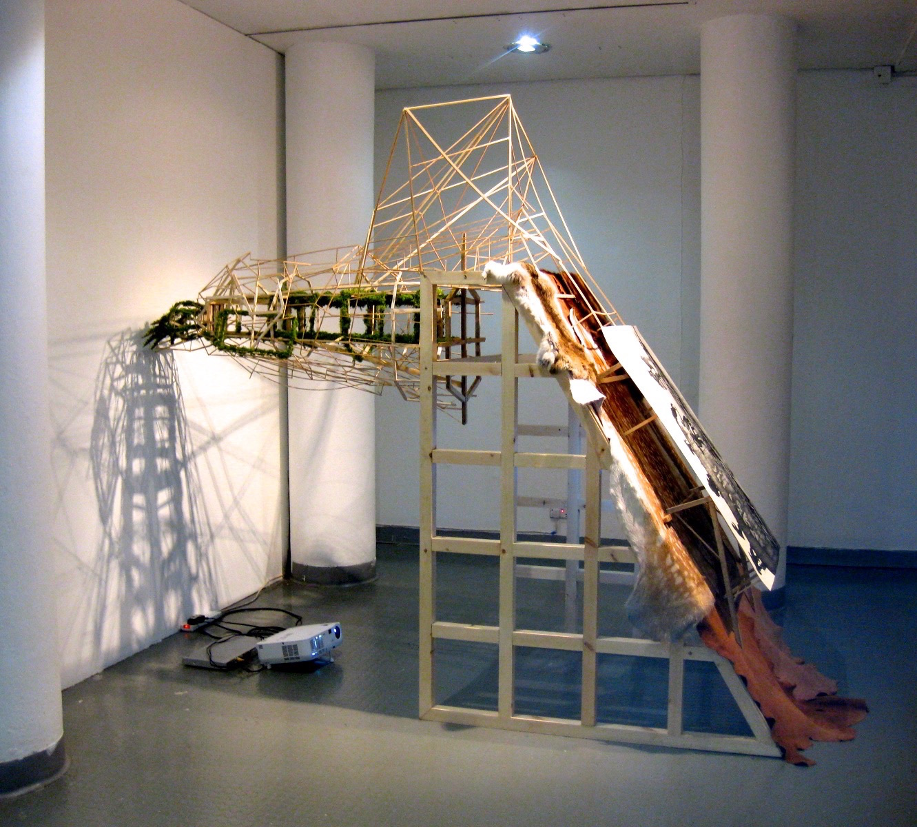 1/2012, Mixed media. Graphite on paper, wood, animal fur, moss and 06:36min video projection, H:210 x W:100 x D:220 cm As the title suggests, the installation is my viewpoint of the year of 2011. The symbol of the statue of liberty, which is half fallen down from the central structure but hanging on against theContinue reading “Two Thousand Eleven”